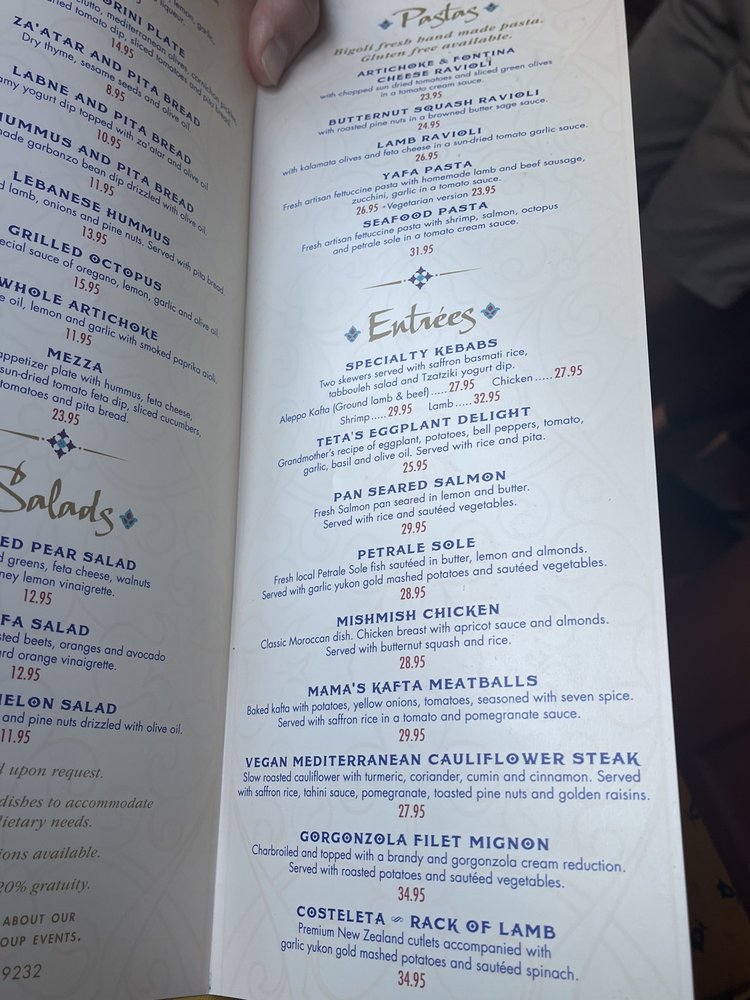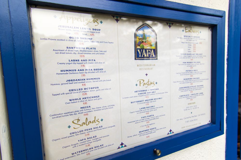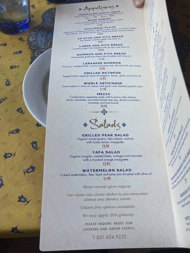 Yafa, located in Carmel-By-The-Sea, CA, offers a diverse Mediterranean menu with vegan and vegetarian options. The intimate and romantic setting is perfect for a date night, with wheelchair accessibility and family-friendly features. Customers rave about the gorgonzola filet mignon, Mishmish chicken, and lamb kebabs. The attentive staff and cozy ambiance make dining at Yafa a memorable experience. Don't miss out on the homemade gluten-free pasta and savory meatball dishes. Make sure to plan ahead if visiting with a large group due to the restaurant's small size. Overall, Yafa is a must-try for those looking for delicious Mediterranean cuisine in a charming setting.